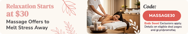 | | Relax with a 60-Minute Massage: Swedish, Thai, Thai Oil or Deep Tissue | | Enchanted Thai Massage & Spa | | Great Falls, VA | (148) | | $129 $65 $58.50 | Sale Ends 6/10 | |  | | Escape to Tranquility with 60-Minute Solo or Couples Hot-Stone Massage | | Oceana Spa | | Rockville, MD | (896) | | $110 $56 $50.40 | Sale Ends 6/10 | | |